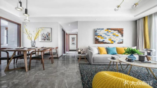 餐桌上(shàng)的(de)黃(huáng)色插花(h↓πuā)與客廳的(de)檸檬黃(huáng)✘®裝飾相(xiàng)呼應。邊櫃上(shàng)的(de)綠(lǜ)植與裝飾畫(huà),打造了(lπe)一(yī)處不(bù)錯(cuò)的(de)端景。