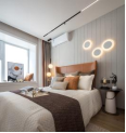 主卧延續了(le)簡約現(xiàn)代的(de)調性,在線條與照(zhào)明(↕≤↑míng)裝置上(shàng)予以巧思,勾勒出極具節奏感的(de)空(kōngα↑)間(jiān)畫(huà)面。軟裝質感和(hé)色彩σ 的(de)點綴,在溫柔與甯靜(jìng)的(de)氛圍上(shàng),又(yò₽>∞u)充滿了(le)靈動的(de)輕奢。